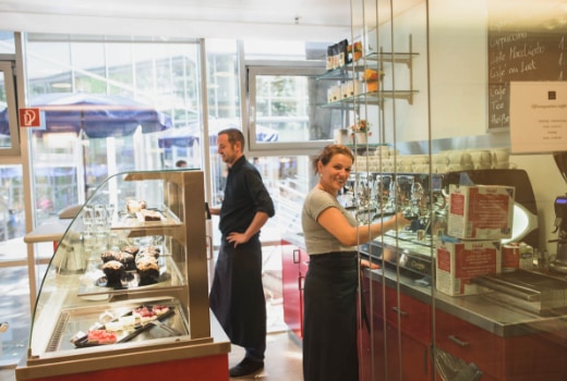 Bücher und guter Kaffee, das gehört irgendwie zusammen. Deswegen gibt es mitten im Verlagshaus eine Cafébar mit einem professionellen Barista. Neben diversen Kaffeespezialitäten gibt es hier auch Tee und kalte Drinks zusammen mit Petits Fours und herzhaften Snacks.